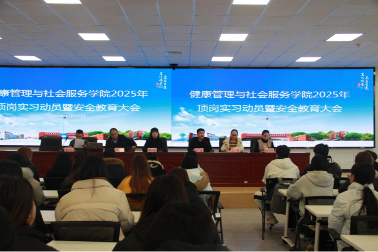 为扎实有序推进2025年学生顶岗实习工作,强化实习过程管理,提升学生安全意识与职业素养,12月11日下午,我院在健康养老教育实训中心A109教室召开顶岗实习动员暨安全教育大会,学院党支部书记周小微、党支部副书记陈明、副院长魏鹏、左莹、学生办公室主任景六平、辅导员张婷婷以及24级3+2全体学生参加了本次大会。大会由学院党支部副书记陈明主持。